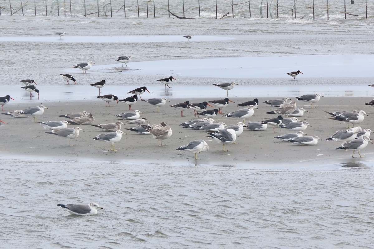 干潮のタイミングだったので、干潟にはカモメやミヤコドリが降りてました。